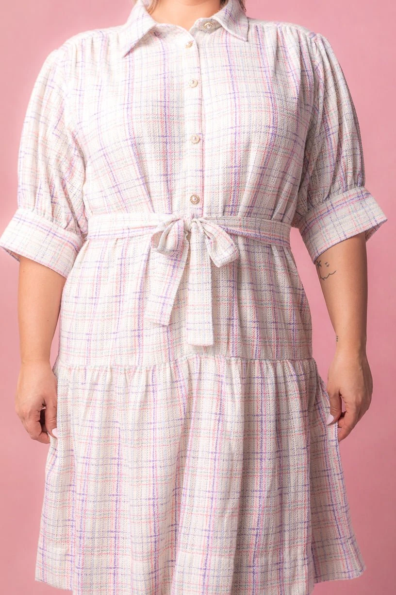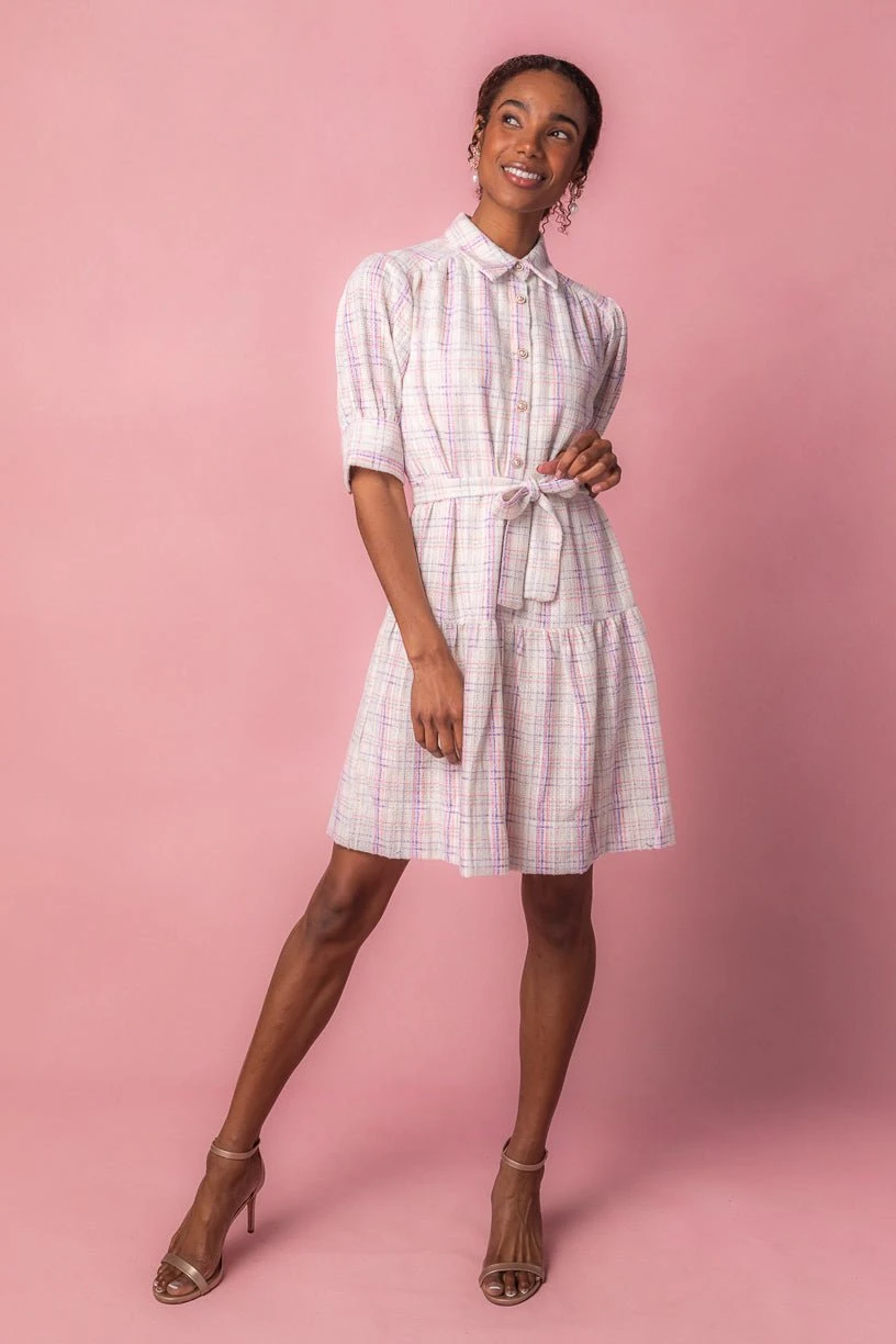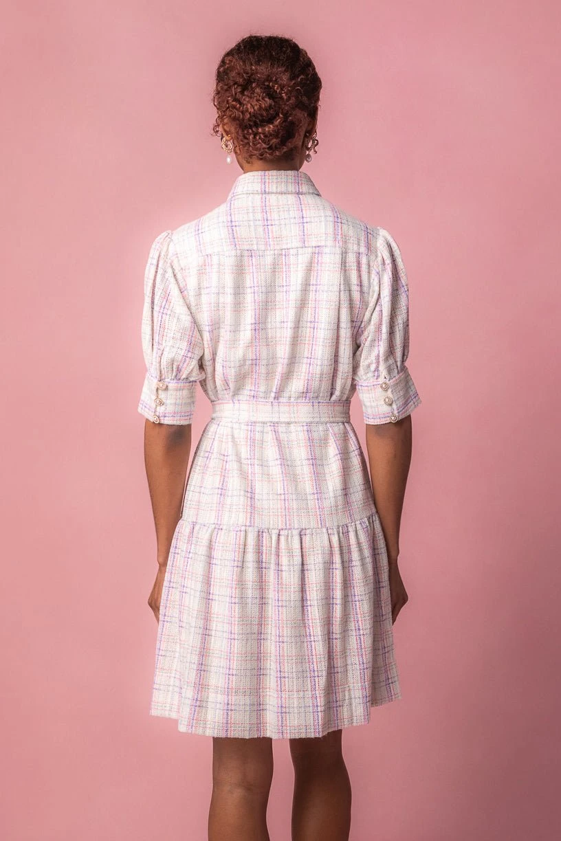 white tweed button up knee length dress