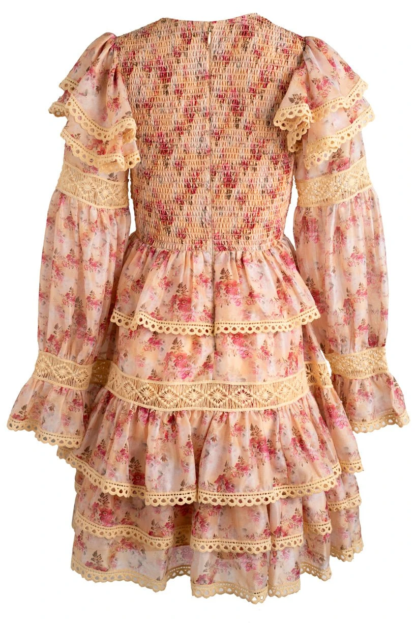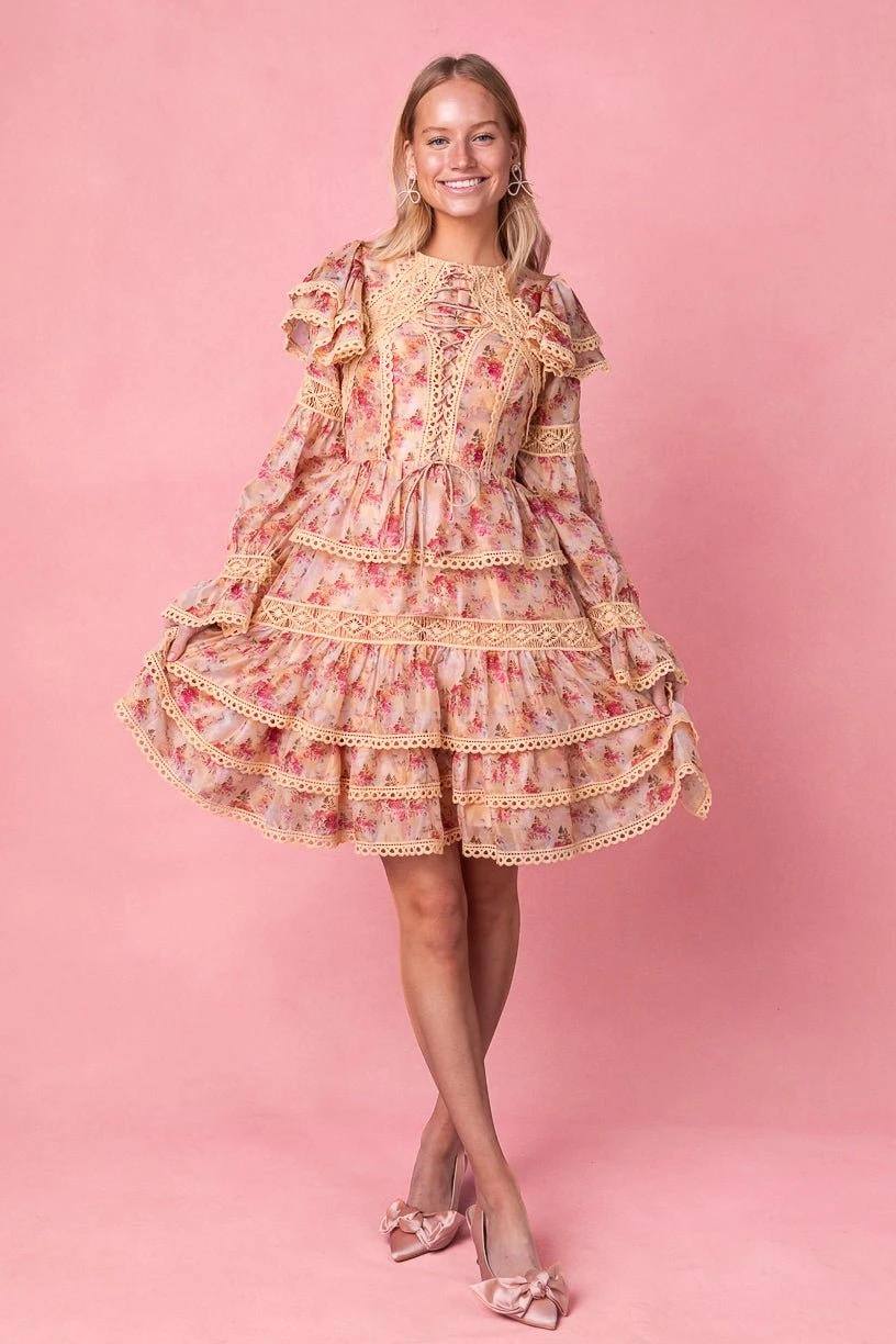 yellow floral long sleeve knee length dress