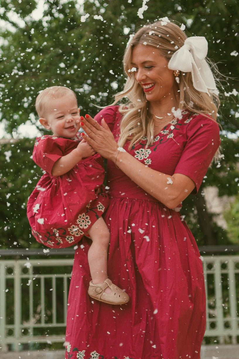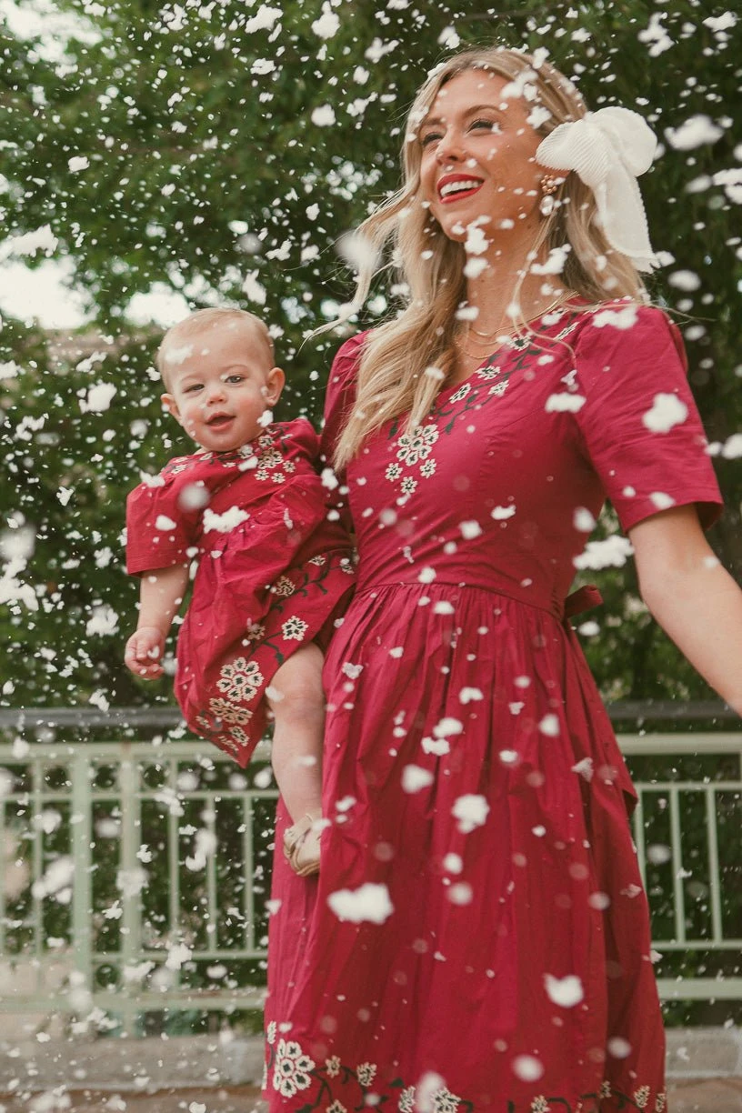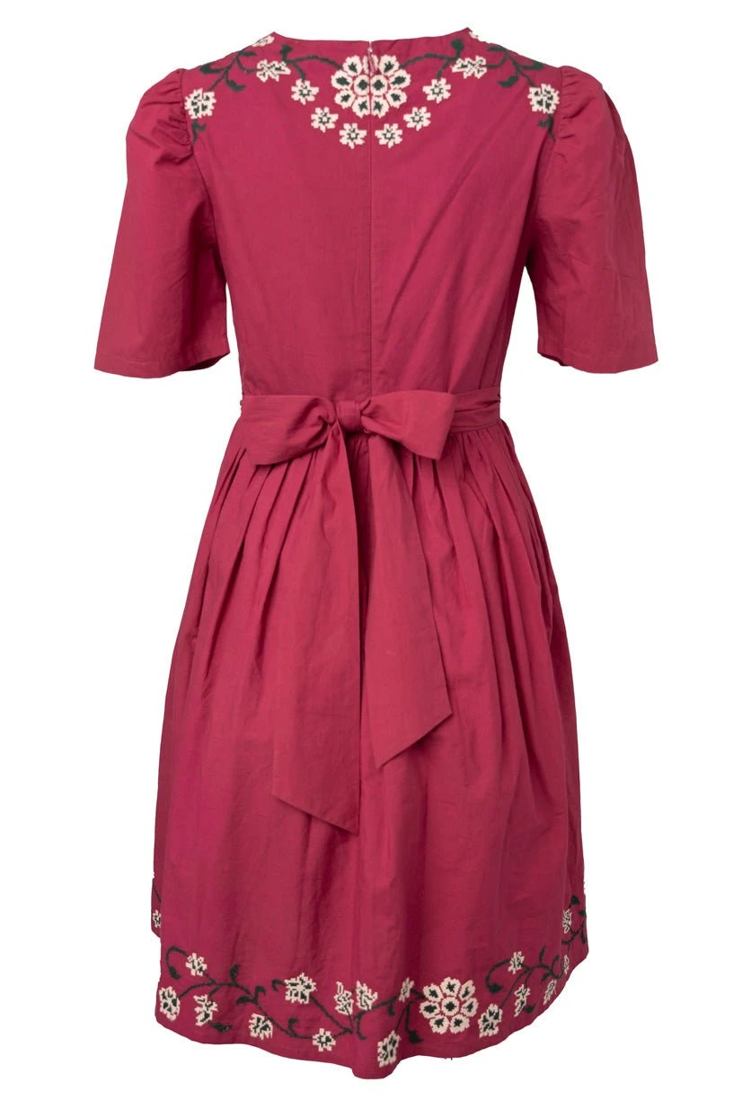 red cotton embroidered knee length dress