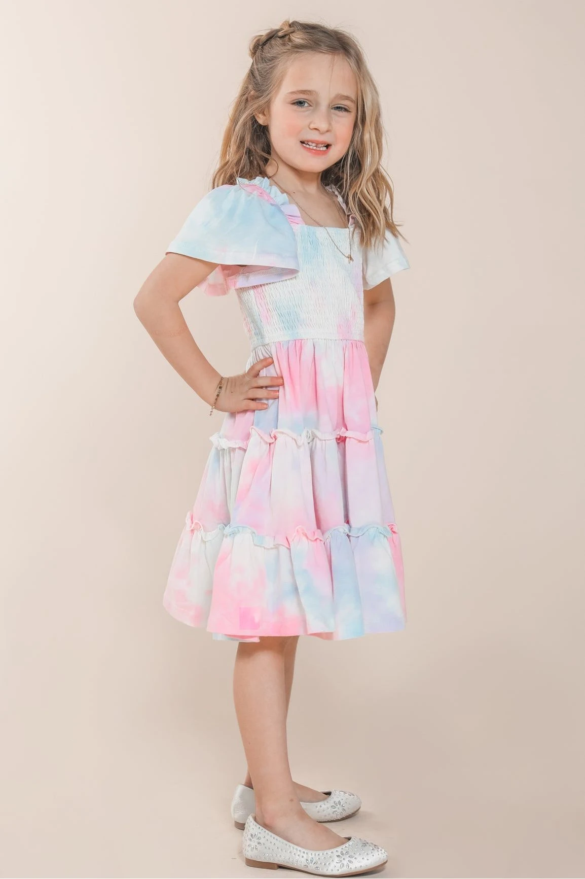 tie-dye flutter sleeve smocked midi dress