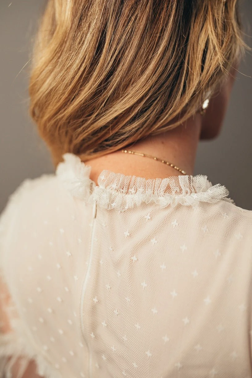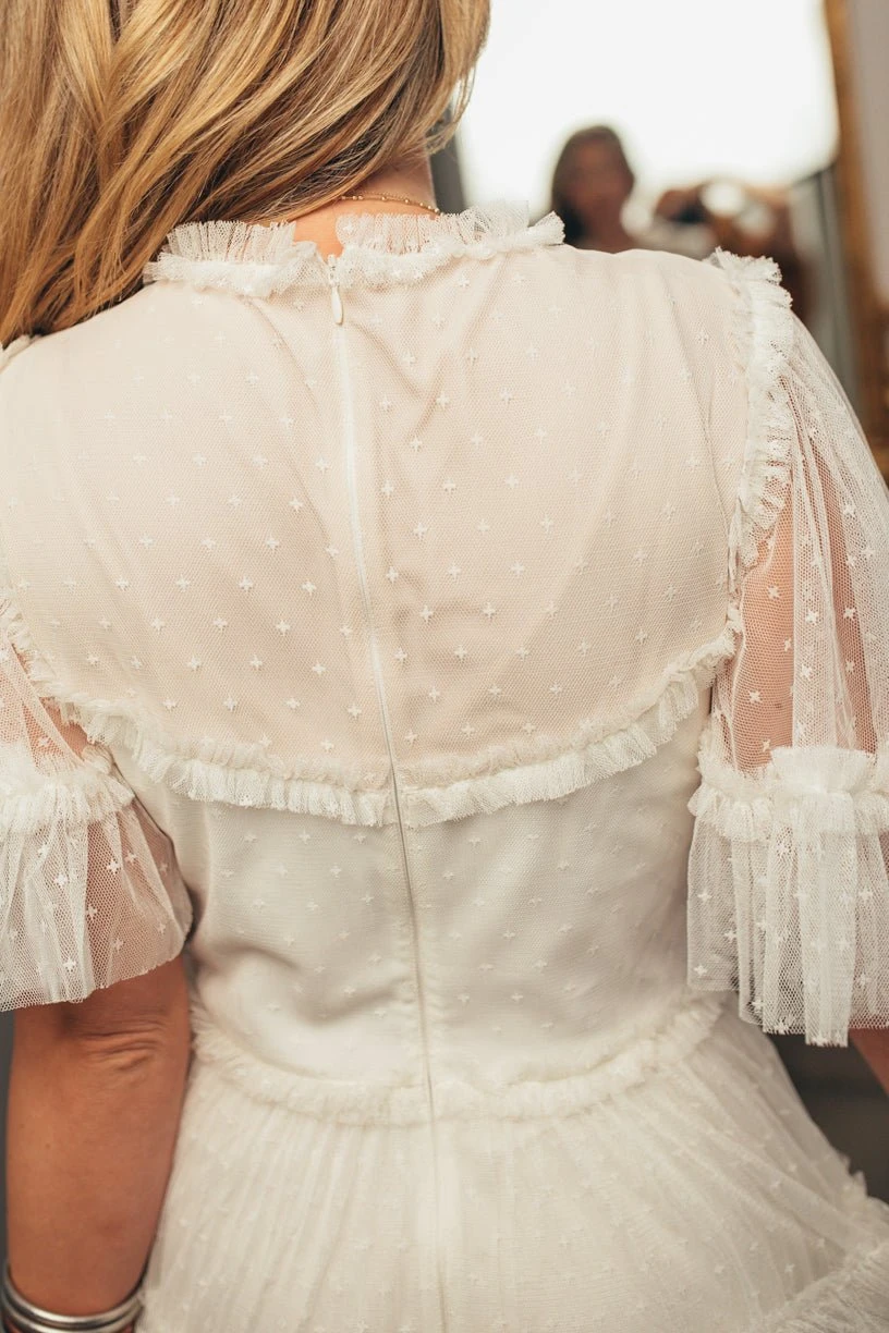 white tulle flutter sleeve tiered maxi dress